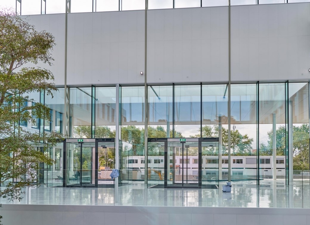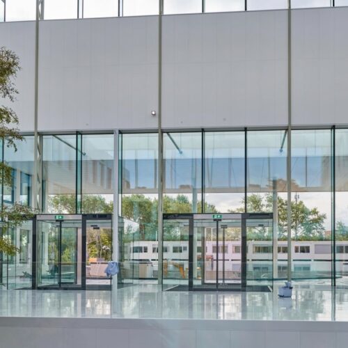 De gevels hebben we geconstrueerd met glaskolommen en zonwerend isolatieglas tot een lengte van bijna 7 meter. De entreepartijen zijn uitgevoerd met gehard en gelaagd glas. We hebben hier gekozen voor zogenaamde volglasconstructies, structureel samengesteld. Er zijn een zestal automatische deuren geïntegreerd. De structuur is mooi afgewerkt met RVS-beplating. De foto’s laten goed zien dat ook in dit project onze “transparante architectuur”-aanpak werkt!